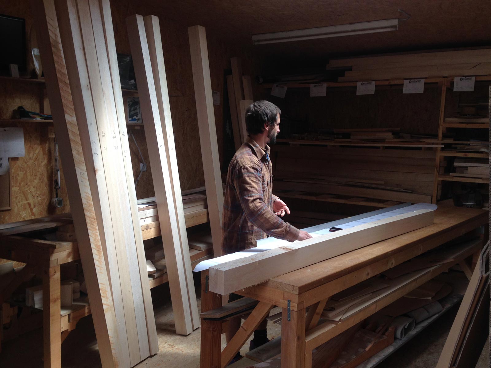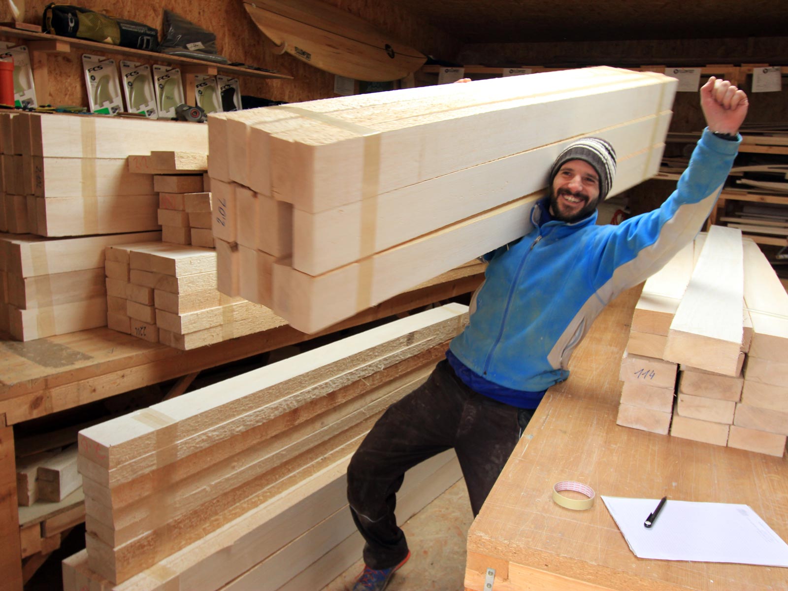 Benni bedient sich seines profunden Wissens, seiner Fähigkeiten, Fertigkeiten und seiner Kreativität, um aus handverlesenen Holzbohlen nicht nur hochprofessionelles Sportequipment, sondern individuelle Kunstwerke entstehen zu lassen.